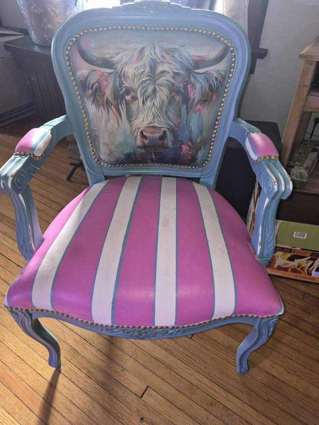 Meet Bessie Blue, the stunning white longhorn cow whose design exudes a canvas-like quality. Against her pristine white coat, bold strokes of azure blue swirl and dance, reminiscent of an artist‘s masterwork on a blank canvas. Bessie Blue is not just a cow; she is a testament to the beauty found in unexpected places. 21"x29"